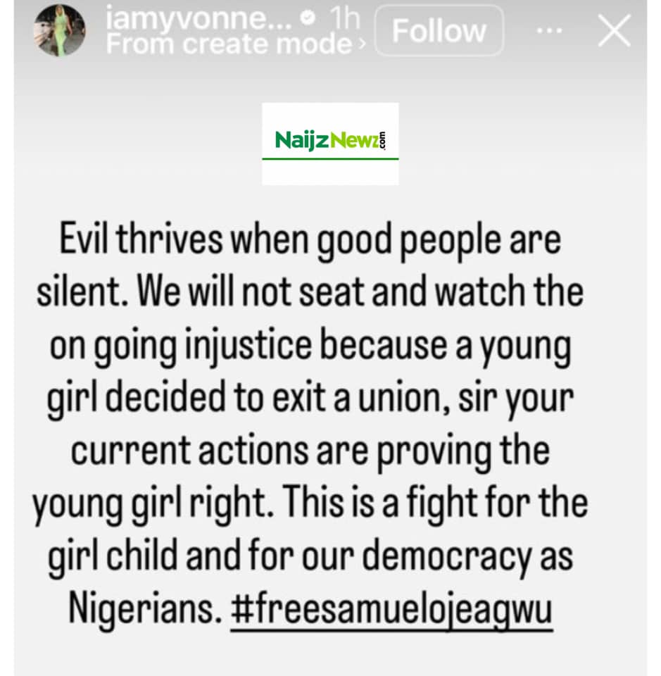 By writing this, Yvonne Jegede backs Regina Daniels, calls for the immediate release of her brother, Sammy, and reinforces the growing public sentiment that the situation is not just a family issue but a matter of human rights and gender protection. Jegede ended her message with the hashtag #FreeSamuelOjeagwu, a social media campaign gaining momentum as more Nigerians express their support for Regina and her family.
