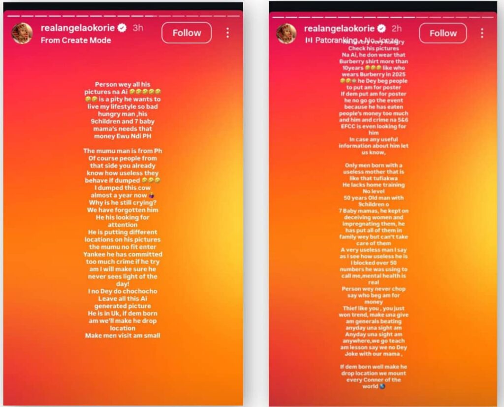 According to the nollywood actress, Angela Okorie, who has never shied away from social media battles, quickly responded through her Instagram story. She clapped back at her ex-lover, accusing him of using artificial intelligence to create an exaggerated online image for himself.