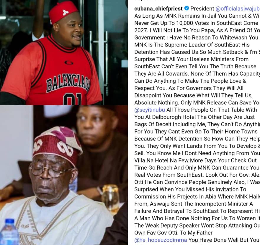 In his lengthy Instagram post, Cubana Chiefpriest made it clear that he was not speaking as a political opponent but as someone offering a blunt warning out of concern. According to him, President Tinubu should never expect meaningful votes from the Southeast in 2027 if Kanu remains incarcerated.