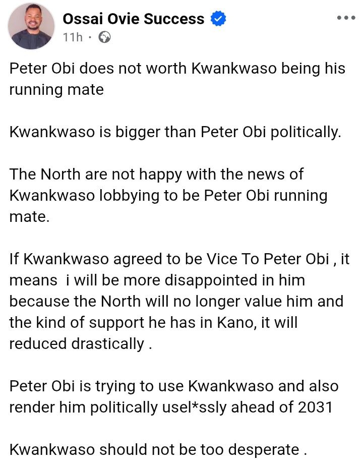 In a Facebook post that quickly went viral, Ossai expressed strong opposition to the rumored political alignment, arguing that Peter Obi does not measure up to Kwankwaso politically. His remarks have since sparked widespread reactions, with many Nigerians taking to social media platforms to either support or challenge his perspective.