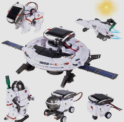 This kit functions as a 6-in-1 STEM robot set that allows children to construct different space-related models, including a space station and a rover. It is designed for children between eight and twelve years old and encourages hands-on learning through building and experimentation.