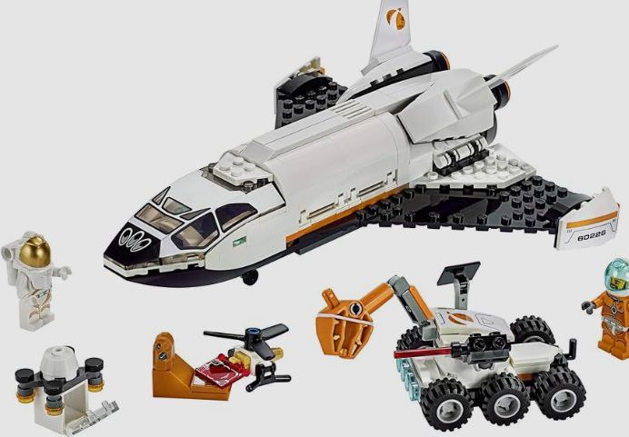The LEGO city Mars research shuttle set allows kids to construct a space shuttle and a Mars rover equipped with a grappling arm designed to collect geodes.