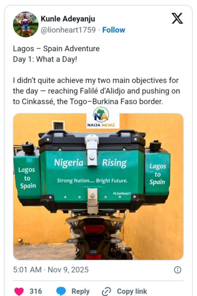 Kunle Adeyanju’s new expedition officially began on Saturday, November 8, marking the start of what promises to be another epic journey. The Nigerian man rides motorcycle from Lagos to Spain as part of his mission to push personal boundaries, promote unity, and inspire young Africans to dream beyond limits. Sharing updates on his official X (formerly Twitter) account, Kunle revealed that he departed from Lagos early in the morning and successfully crossed into Benin Republic on the first day. He also mentioned that he is currently in Togo, where he spent the night before continuing his trip across West Africa.