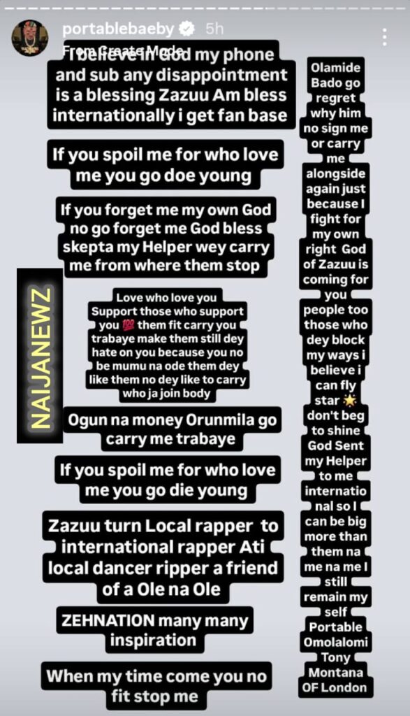The ongoing drama sparked by “Olamide Will Regret Not Signing Me” has resurfaced after Nigerian singer Portable released a long emotional message online just hours after Olamide’s highly successful UK show. The singer used the opportunity to restate his belief that the YBNL boss would one day “regret” not offering him a record deal, insisting that his journey to global fame remains unstoppable.