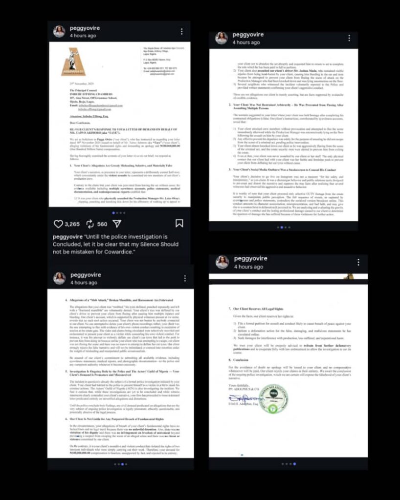 Peggy claimed that Taye first assaulted the production manager, Luke Obayi, during a brief dispute. The actress also said he went on to head-butt her driver, Joshua Madu, leaving him bleeding from the ears and nose. She added that several crew members submitted written accounts to the police confirming these alleged assaults.