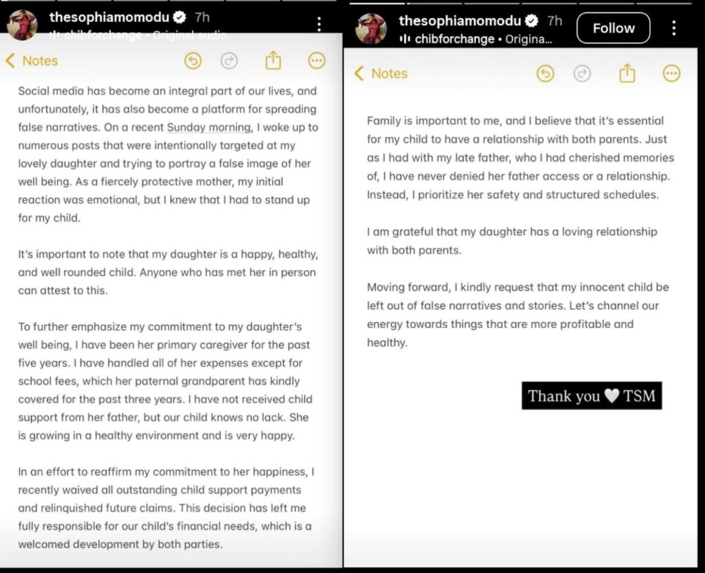 She explained that for the past five years, she has primarily been responsible for all financial obligations tied to raising their daughter. According to her, the only exception has been school fees, which she acknowledged have been covered generously by the child’s paternal grandparent. Sophia highlighted that she has single-handedly managed every other need, ensuring that their daughter lacks nothing essential. Screenshot of her IG post is below.